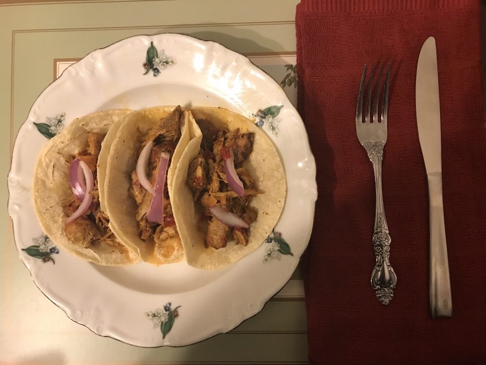 “This one is probably my favorite so far. The pork was good and the juice it marinaded in gave it a great taste. I’d recommend not pouring the lime juice/habanero sauce on until you’ve tasted the meat first. I put way too much of it on my first serving and it made it taste far too tangy, so I’d recommend serving it on the side. The one big thing that I didn’t like about this recipe was that the corn tortilla shells we used were very thin and fell apart very easily after we put the meat in them.”