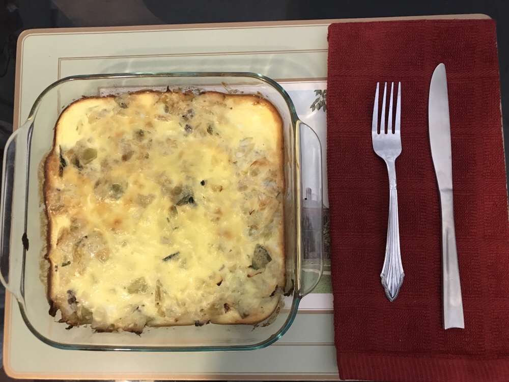 Preheat your oven to 350. Grease a casserole dish(I used an 8×8 dish), and start layering your meat mixture and your cabbage. Make sure to start and end with the cabbage. Add the sour cream to the beaten eggs and mix well. Pour the sour cream and egg mixture over the top of your casserole. Bake for about 40 min. If the top is getting brown too quickly, cover your dish with foil. Serve hot.